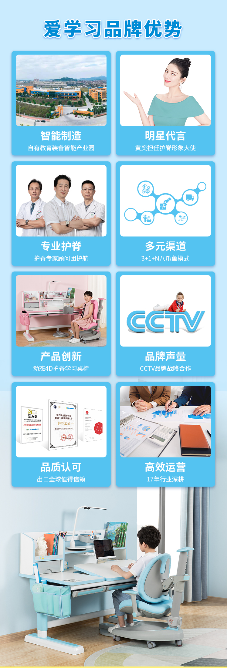 愛學(xué)習(xí)創(chuàng)立于2004年,專注學(xué)習(xí)桌椅用品20年,隸屬于福建建晟家具集團,總部位于漳州,是一家集自主設(shè)計、研發(fā)、生產(chǎn)、銷售、推廣、服務(wù)于一體的大型綜合性兒童學(xué)習(xí)桌椅用品品牌,業(yè)務(wù)范圍涉及全球40個以上國家和地區(qū),愛學(xué)習(xí)自擁2大產(chǎn)業(yè)園,是目前國內(nèi)單體規(guī)模最大、行業(yè)領(lǐng)先的學(xué)習(xí)桌椅智能產(chǎn)業(yè)園。